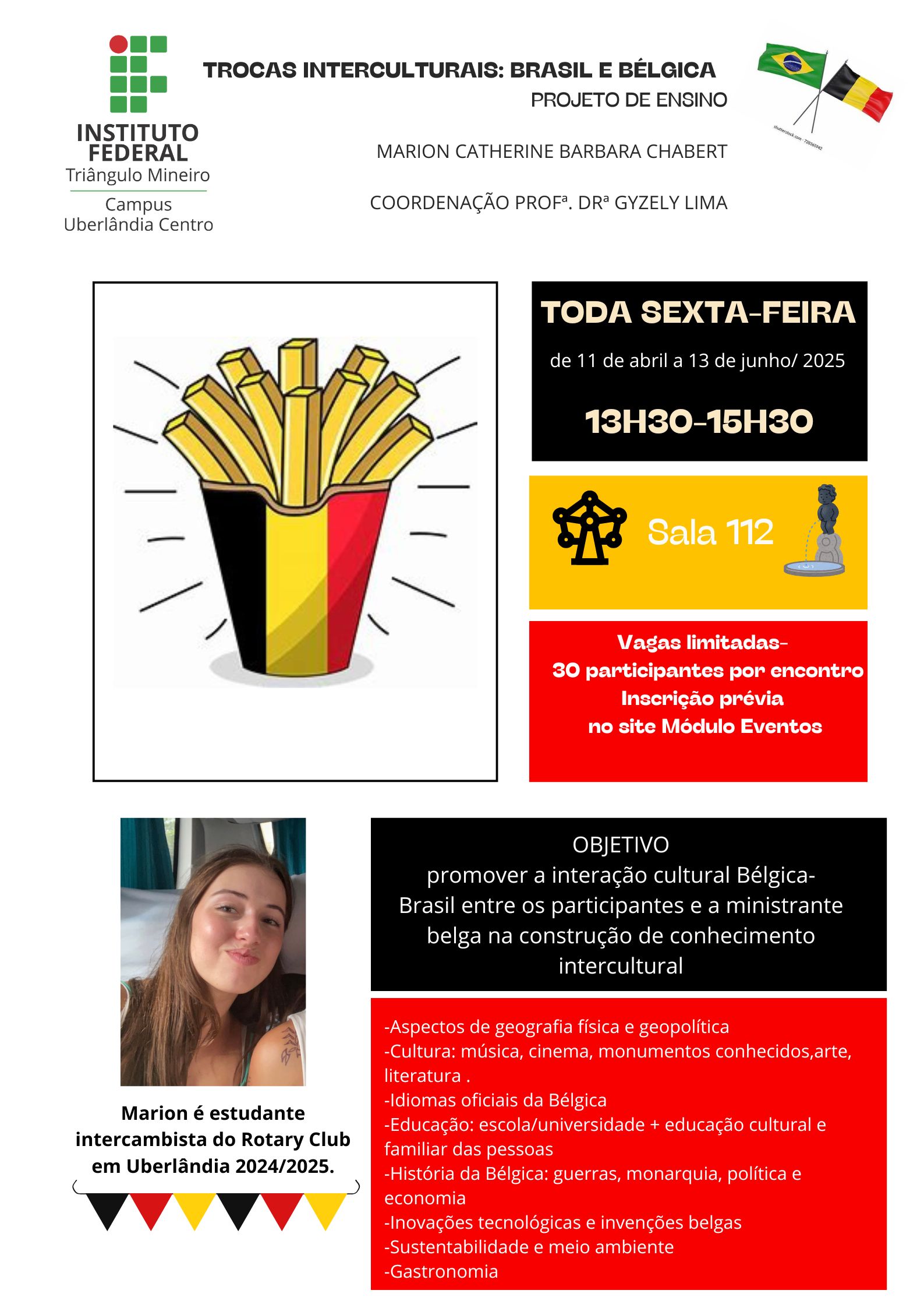 A proposta de trocas culturais entre Bélgica e Brasil se fundamenta a partir da concepção de Paulo Freire (1989) que destaca o seguinte: “É preciso ser consciente de si mesmo, do seu mundo e da realidade do outro. E para ter essa consciência do seu mundo, é preciso por vezes sair dele e entrar na realidade do outro, pisar seu chão, ver com os olhos do outro.” Nessa perspectiva este projeto de ensino justifica-se pela oportunidade de promover a interação intercultural entre estudantes brasileiros do nosso campus com a estudante intercambista visitante da Bélgica que está interessada em conhecer a cultura brasileira e aprofundar seu aprendizado de língua portuguesa em um contexto escolar. Vale ressaltar que a educação intercultural proporciona ao público uma interação social de conhecimento do seu próprio mundo ao conhecimento do mundo do outro. Limite de 30 participantes por encontro. Inscrições gratuitas pelo site do módulo eventos a cada atividade proposta.