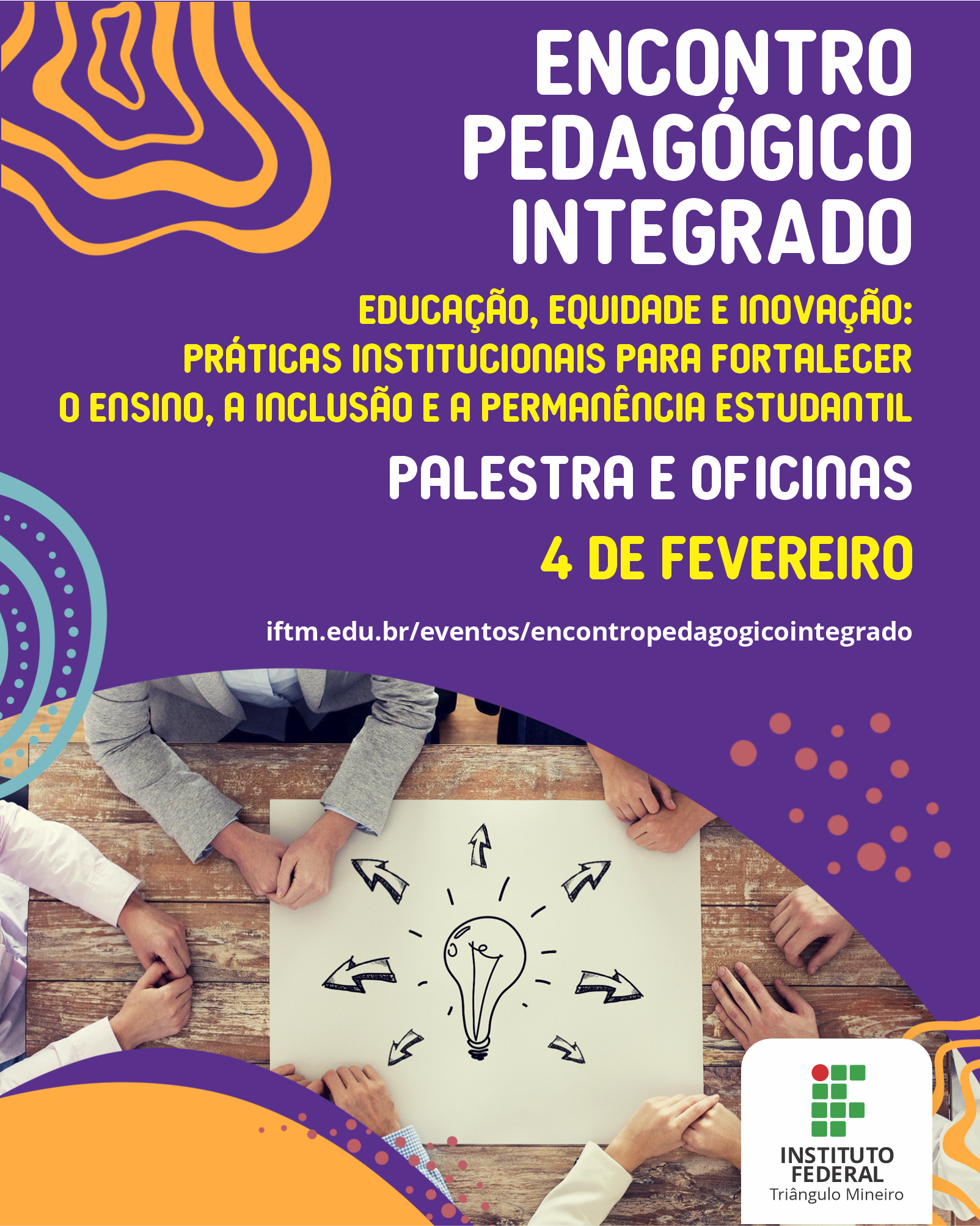Buscando a integração da Reitoria e dos campi do IFTM no início do ano letivo de 2026, o I Encontro Pedagógico Integrado, com o tema ‘Educação, Equidade e Inovação: práticas institucionais para fortalecer o ensino, a inclusão e a permanência estudantil’, será realizado durante a semana de reuniões pedagógicas dos campi. Serão ofertadas uma palestra de abertura e diversas oficinas sobre temas relevantes do cotidiano escolar e acadêmico, com o objetivo de fortalecer a formação e a atuação dos servidores do IFTM.