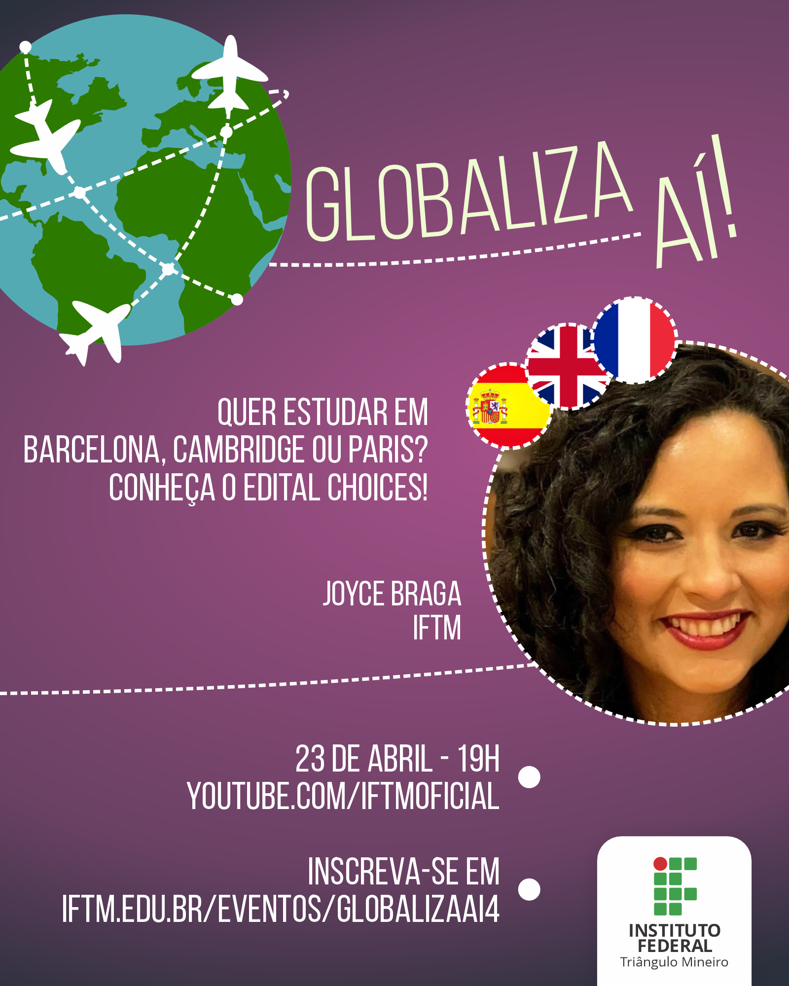 Com o tema “Quer estudar em Barcelona, Cambridge ou Paris? Conheça o edital Choices!, esta edição do Globaliza Aí! tem como objetivo apresentar aos estudantes do IFTM as principais informações sobre o Edital Choices e orientar os interessados quanto ao processo de candidatura. Durante a palestra, serão abordados os critérios de participação, as etapas de inscrição e a organização da documentação necessária. Também será apresentada a proposta da mobilidade internacional, com duração de duas semanas, incluindo detalhes sobre o curso, o processo de seleção e as etapas de preparação pré-viagem até o embarque. Ao final, haverá um momento destinado ao esclarecimento de dúvidas, possibilitando aos participantes compreender melhor as oportunidades oferecidas pelo edital e os procedimentos para participação.