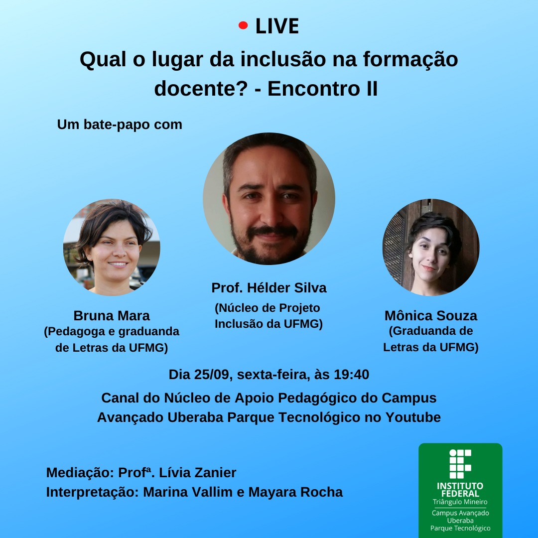 A segunda edição da live "QUAL LUGAR DA INCLUSÃO NA FORMAÇÃO DOCENTE?" contará com as experiências do professor Helder Henrique da Silva ( do Núcleo de Projeto Inclusão UFMG) e de suas alunas Bruna Mara (pedagoga e graduanda de Letras da UFMG) e Mônica Souza (graduanda de Letras na UFMG). Eles falarão sobre suas experiências com inclusão, sobre seus trabalhos focados na observação e acolhimento de cada aluno como um sujeitos multidimensionais, inteiros e únicos. venha refletir com eles sobre as muitas possibilidades de nos engajarmos em importantes ações no trabalho educacional dedicado a alunos com necessidades específicas. O evento será transmitido pelo canal do Núcleo de Apoio Pedagógico do Campus Avançado Uberaba Parque Tecnológico no Youtube. Faça suas inscrições no chat do evento e também contribua enviando suas perguntas.
