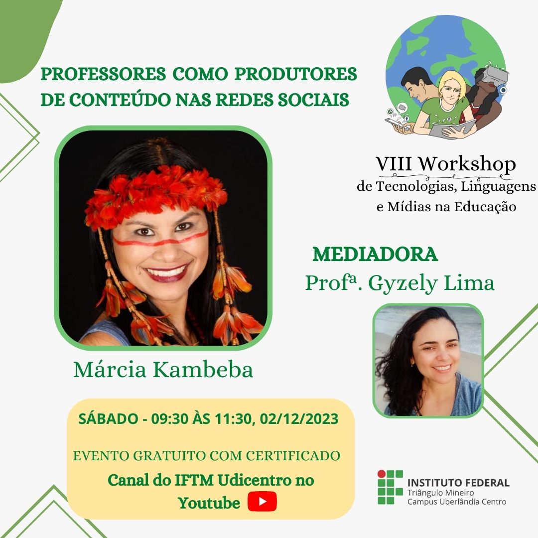 Com a temática “Professores como produtores de conteúdo nas redes sociais”, a proposta do evento “VIII Workshop em Tecnologias, Linguagens e Mídias em Educação” visa propiciar a divulgação científica de trabalhos acadêmicos nas áreas de ensino, pesquisa e extensão, com o intuito de difundir e propagar os saberes relacionados ao campo da Educação. Palestra de abertura com Márcia Kambeba, mestre em Geografia, Doutoranda em Estudos Linguísticos, poeta, escritora, palestrante e ativista indígena do povo Kambeba. Mediação da professora Drª. Gyzely Lima, IFTM Campus Uberlândia Centro